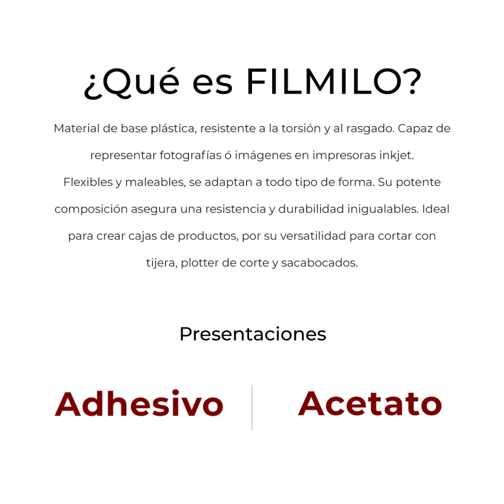 Expresá la belleza de tus productos transformando su presentación.De base plástica, super resistentes y maleables para trabajar, están diseñados para ser impresos con tintas fotográficas inkjet. Contamos con una amplia variedad de micronajes para que encuentres el Filmilo que se adapta a cada detalle de tu proyecto. Vienen en dos presentaciones Adhesivo y Acetato.
