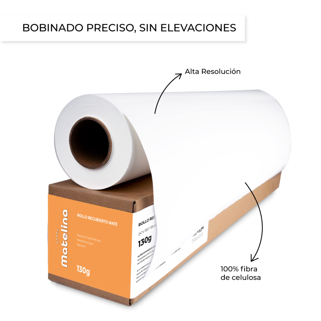 Papel recubierto mate para usar en plotters de impresión con tintas DYE/PIGMENT. Calidad Premium, bobinado preciso, sin elevaciones, alta resolución mate, Encapado diseñado para secado rápido. 100% fibra de celulosa, buje 2” Aplicaciones: Fotográfia, gigantográfias, publicidad y para montar en portabanners.